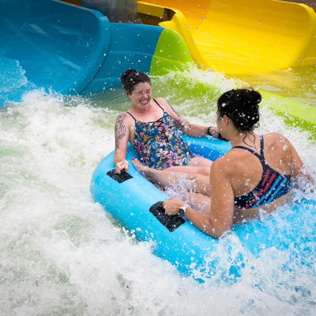 Experience the only waterslide of its kind in the world at Zoombezi Bay! Starting 51 feet in the air, Captina Falls lets two guests race one another head-first to the bottom, through enclosed tubes, rally points, and high speed turns on the only RallyRACER with FlyingSAUCER 8'S in the entire world! There’s even a racing timer – compete for the best times and see who wins!